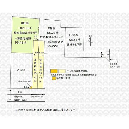 【接道】 一方 ( 公道 南 12m ) 航空法/景観法/22条区域/農地法/土地面積189.35m2+協定通路部分55.43m2/上下水道埋設管引込整備(予定) |