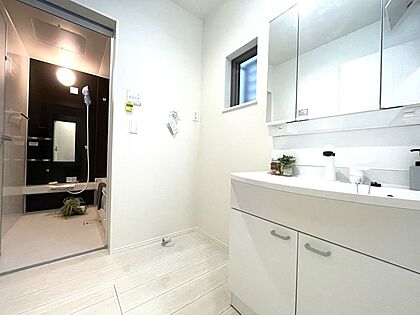 三面鏡にハンドシャワー付き、 使いやすい洗面台。
