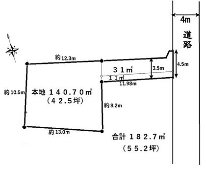 | 土地面積/坪(坪単価) | 182.70m2/55.36坪(3.80万円) | 代表的な接道 | 一方 公道 東 4m ※詳細は備考欄をご確認ください |