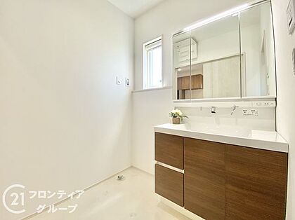 ゆったりとした洗面スペースは、広さと明るさをしっかり確保し、使いやすさに配慮された設計。収納や機能面も充実しており、ご家族全員が毎日快適に使える暮らしやすい空間となっています。