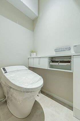 レストルームには洗練されたお部屋にぴったりなスタイリッシュなタンクレストイレが設置されています。収納に便利なカウンターも備え付けです。