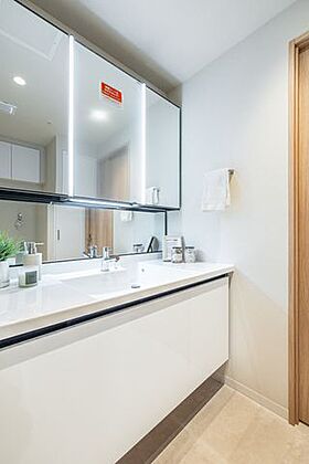 空間に美しく溶け込むスタイリッシュなデザインの洗面化粧台。三面鏡裏や足元の収納など使いやすさも兼ね備えています。