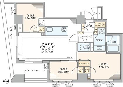 開放的な約13m2のL字型バルコニー付き。LDは二面採光で明るい間取りのファミリータイプのお部屋です。