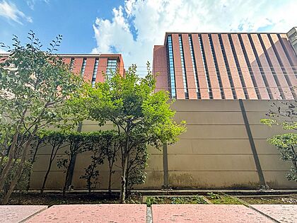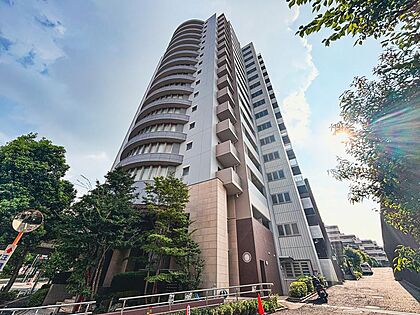 緑豊かな街並みに調和する、優美な曲線が印象的なランドマークレジデンス。気品ある佇まいが、住まう方のステータスを物語ります。青空に映える美しい外観です。