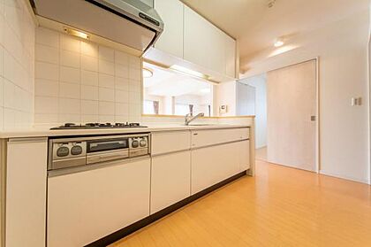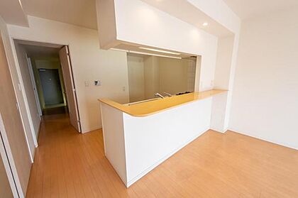 背面にゆとりのある対面式カウンターキッチン。冷蔵庫などの家電を置く場所もあり家事動線が確保されています。