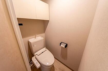 収納棚付きトイレは洗剤やトイレットペーパーストックを綺麗に隠して収納出来ます。