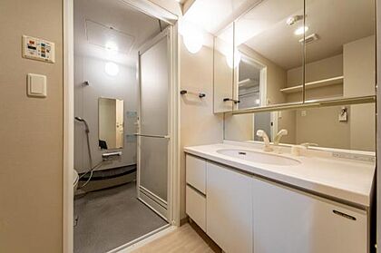 ワイドサイズの化粧洗面台。朝などの忙しい時間帯には家族で並んで身支度できます。