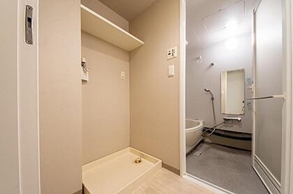 洗濯機置き場の上には収納棚ががあり、ランドリー周りを便利・快適にします。