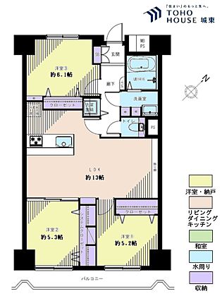 3LDK、専有面積71.15平米、バルコニー面積6.32平米