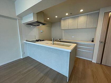 グレージュカラーで備え付けのカップボードがあり、まとまりのあるキッチンです。