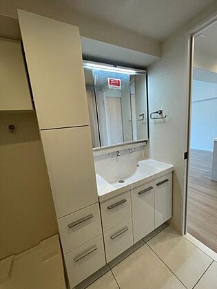 見てわかる収納力の多さ。スタイリッシュな洗面台で身支度も整いやすく♪