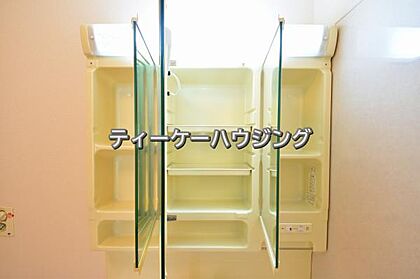 三面鏡の裏には収納がたっぷり。洗面室をすっきりきれいに使えます。