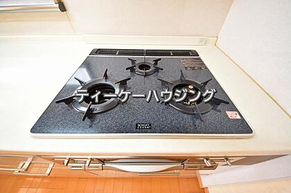 三つの調理が同時に出来てお料理時間を一気に短縮。三口ホーロートップコンロ