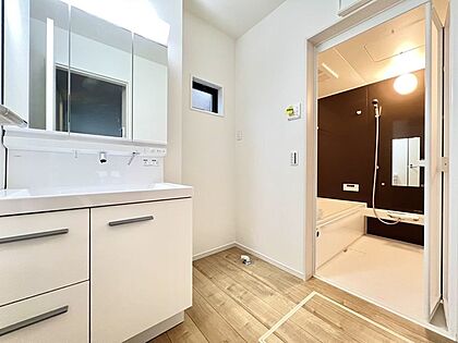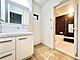 三面鏡を採用した洗面化粧台。鏡の裏にも収納スペースがあります。