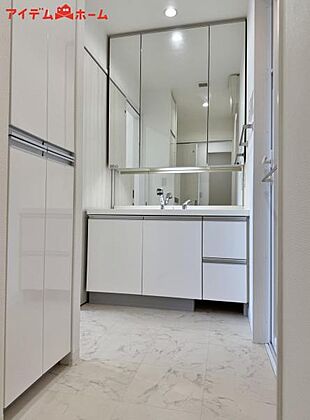 ゆとりの洗面スペースで朝の身支度も快適スムーズ。 鏡の裏にはたっぷりと収納を装備