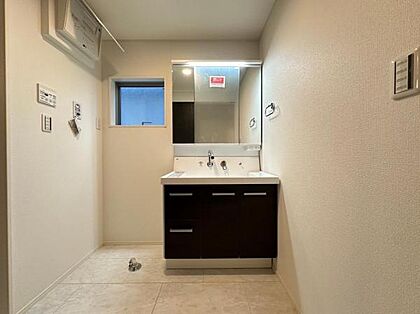 参考プラン・独立洗面台施工例写真 三面鏡には照明があり、身だしなみを整えるのに便利です。洗面まわりの小物はミラーボックスに、タオル類は足元の引き出しに収納できます。