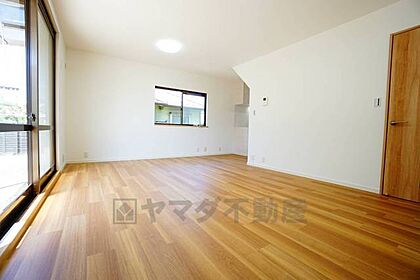 大きな窓のあるリビングは、陽光あふれる明るい空間です。居心地良く、ご家族皆がゆったり寛げる憩いの空間となりそうです。