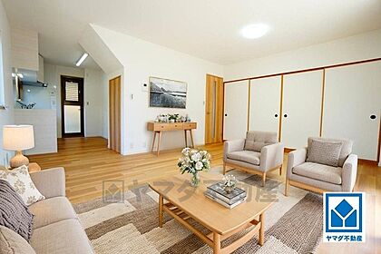 家具はイメージです。リビングは広々とした設計で、家族が集い、寛ぐ暮らしの空間を演出しています。思い思いの時間を過ごしたり、家族みんなで食事をしたり、素敵な団らんの場になりますね。