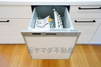 食事の後の手間を解消する食器洗い乾燥機付。冬場の洗い物で手荒れの悩みもなくなります。手洗いよりも節約できて便利。