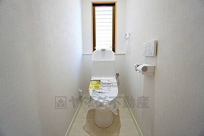 温水洗浄機付トイレです。節水機能もあるので、安心して使えますね。もちろん、1階2階の2ヶ所にトイレがあるので、忙しい朝にもゆとりができますね。