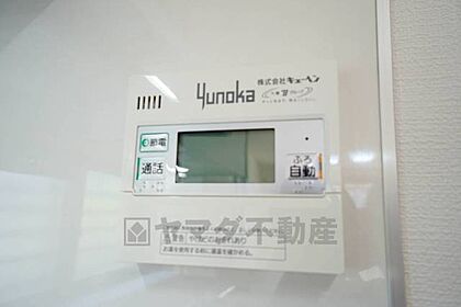 キッチン横からお湯張り、追い炊き、足し湯がボタン一つで楽々操作できる給湯機リモコンです。忙しい夕飯準備の時間帯に重宝しますね。