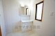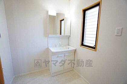 三面鏡つき洗面台。鏡裏にたっぷりとした収納スペースがあります。鏡を閉めてしまえば小物は見えないため、スッキリとした印象の洗面台にできます。