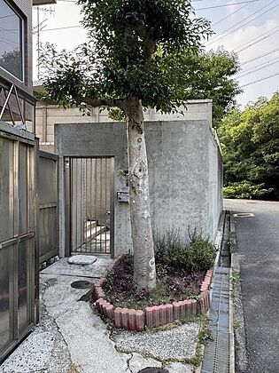 門扉から建物玄関へ続く階段アプローチ前にある植栽を東方向へ撮影。