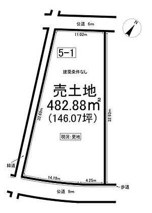 | 土地面積/坪(坪単価) | 482.88m2(登記簿)/146.33坪(5.80万円) | 代表的な接道 | 二方 公道 南東 9m、北西 6m ※詳細は備考欄をご確認ください |