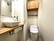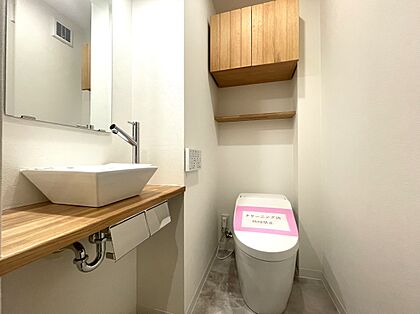タンクレスですっきりとしたデザインのウォシュレット付きトイレです。吊戸棚収納やミラー付の便利な専用手洗いスペースが設けられています。