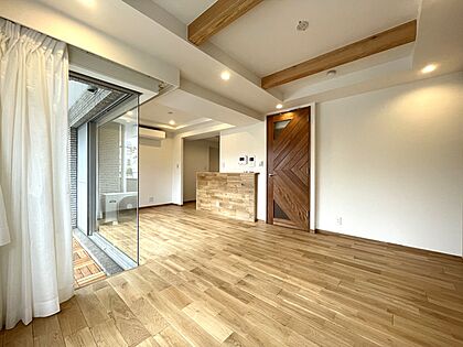 約15.4帖のLDKは天然無垢のオーク材をふんだんに使用したフローリングや建具の内装で柔らかな美しい木目で木の温もりを感じます。上質な素材を使って造り上げた空間には高級感があります。