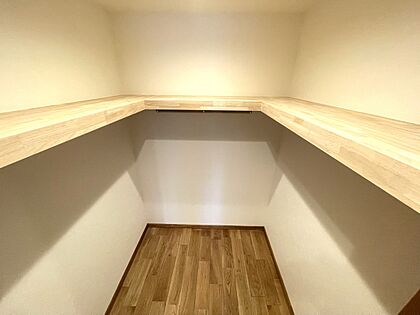 ウォークインクローゼット内部は、室内灯やコの字型に枕棚とハンガーパイプが設置されていて見渡しやすく、衣類だけでなくバッグなども整理しやすい造りです。大きな荷物も収納できて重宝します。