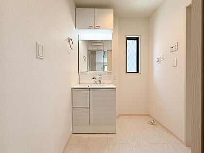 明るく収納も豊富で機能的な洗面化粧台。ランドリースペースも含めた脱衣所。