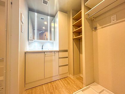 【脱衣場】脱衣所、洗面所は小さなプライベートスペース。歯磨き、洗顔と毎日施す個人空間。換気も設置して、熱気などを開放して、爽やかなスペースになるように設計されています。
