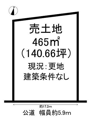 | 土地面積/坪(坪単価) | 465.00m2(登記簿)/140.91坪(36.90万円) | 代表的な接道 | 公道 南 5.9m ※詳細は備考欄をご確認ください |