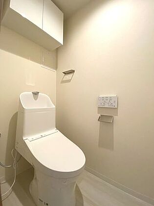 温水洗浄便座付トイレ。上部収納でペーパーや掃除用品の収納も可能です。