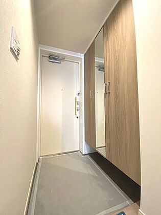 シューズボックスを設置した玄関。姿見付きでお出かけ前の身だしなみ確認も可能です。