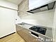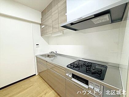 効率よく料理ができる三口コンロを備えたキッチンです。十分な収納スペースがあり、調理道具もすっきり片付きます。