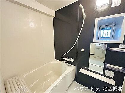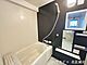 シンプルながら黒の壁が映える浴室です。落ち着いたデザインで、足を伸ばして心地よくリフレッシュできます。
