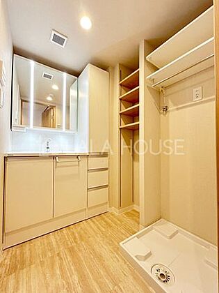 3面ミラーの後ろは収納スペースを完備。生活感のあるものは隠して、スッキリシンプルな洗面台に!