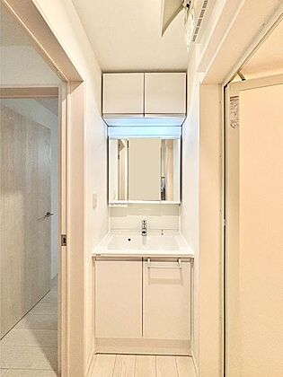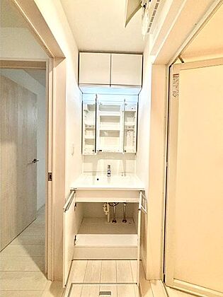 三面鏡の裏に、化粧品や衛生用品などを収納可能。洗面台をすっきりと保ちます!