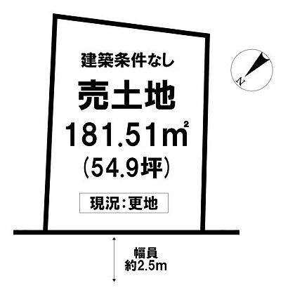 | 土地面積/坪(坪単価) | 181.51m2/55坪(5.10万円) | 代表的な接道 | 公道 北西 2.5m ※詳細は備考欄をご確認ください |