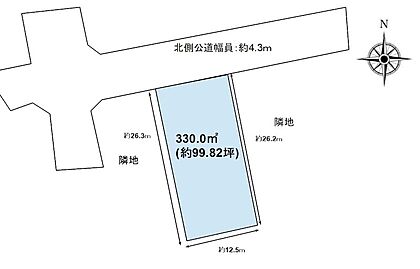 | 土地面積/坪(坪単価) | 330.00m2(登記簿)/100坪(3.50万円) | 代表的な接道 | 一方 公道 北 4.3m ※詳細は備考欄をご確認ください |