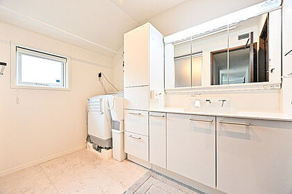 ※販売対象に家具・調度品は含まれません。洗面化粧台は、身支度がしやすい三面鏡付きのワイドタイプ。窓があり、換気が可能です。