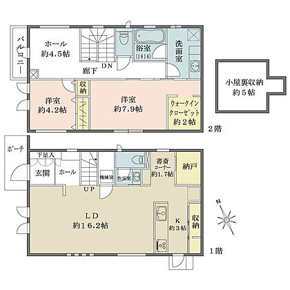 書斎コーナーや2階のホール、2カ所の洗面所とトイレなど、アイデアが詰まっています。豊富な収納も魅力。