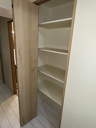 廊下部分に設けられた収納スペース。棚板は可動式のため用途に応じて調整でき、無駄なく整理整頓できます。【収納/廊下】