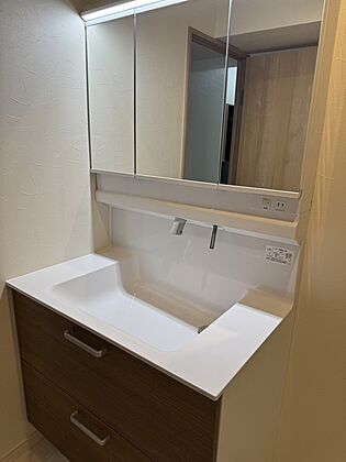 3面鏡タイプの洗面化粧台です。引き出しや鏡裏に収納あり。タオルや洗剤、化粧品などが整理整頓できます。【洗面台・洗面所】