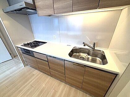 ディスポーザーや食器洗乾燥機、浄水器、3口コンロ等、機能充実のシステムキッチン。吊戸棚等収納も豊富。【キッチン】