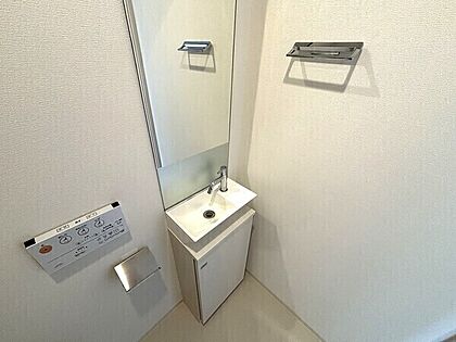 トイレ内には独立した手洗い器と鏡が備え付けられています。使用後すぐに手を洗うことができ、衛生的です。【手洗い場/トイレ】
