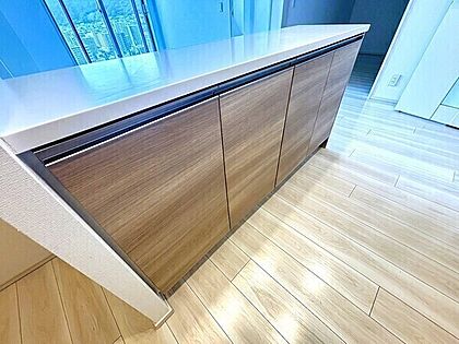 収納力のある対面式キッチンカウンターが備わっています。配膳・下膳や盛り付け等の調理作業にも便利です。【キッチン】