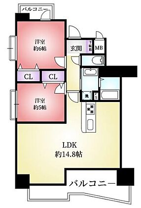 2つの洋室と約14.8帖の広々としたLDKが特徴の間取りです。各居室にはクローゼットが付いています。バルコニーが2か所あり通風や採光にも配慮されています。水まわりがまとまっていて使いやすい動線です。